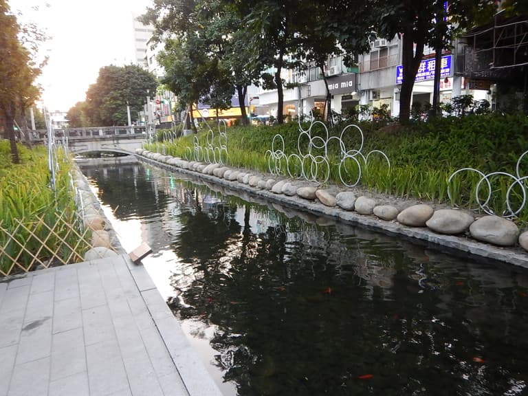 宮原眼科の前を流れる夕暮れの川沿いも散歩してみました。この川は流れが妙に早くて、金魚達が必死に泳いでいました。
