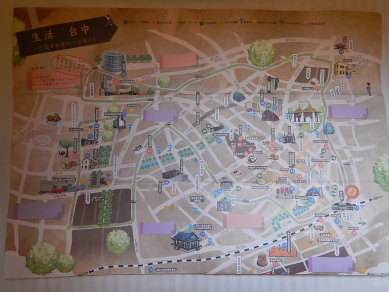 歴史建築や台中グルメ情報など、かわいいイラスト付きで紹介されています。よし、これ見て散策するぞぉー。