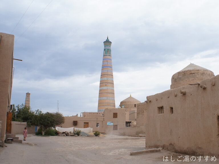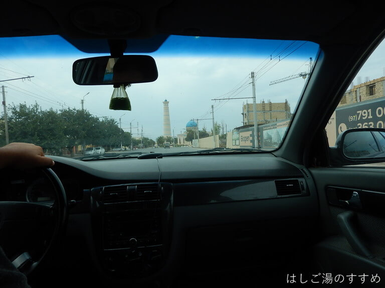 そうこうしているうちに、いつの間にかヒヴァに到着。なにやら前方にブハラのカラーンミナレットに負けず劣らずの巨大なミナレットが見える。そして青いドームも。