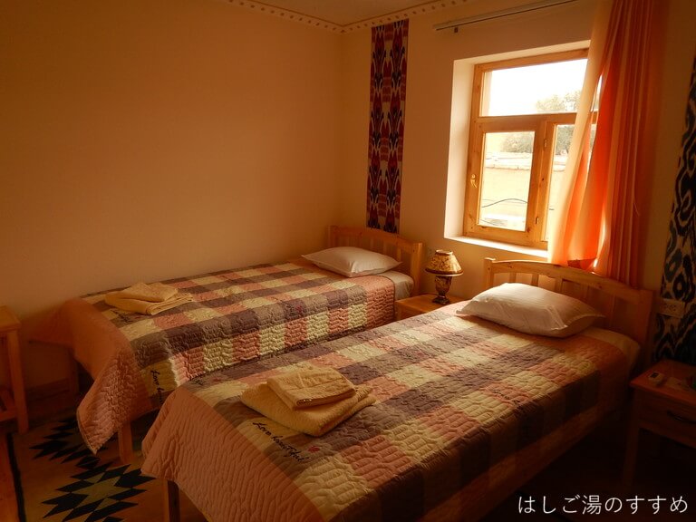 こぢんまりとした部屋は、ウズベキスタンをイメージする敷物や小物などがセンスよく飾られて、とにかくカワイイ。私達のようなヨレヨレバックパッカー中年夫婦より、キラキラな若い女の子二人で利用してもらいたい。訪問時は二部屋営業だけど、今後もう少し部屋数を増やしたいとのこと。