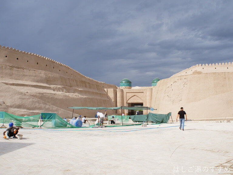 修復作業が行なわれてました。工事現場の看板には中国語が大々的に掲げられてます。一帯一路関連なのか、ウズベキスタンでは中国との関りを強く感じる場面が多い。