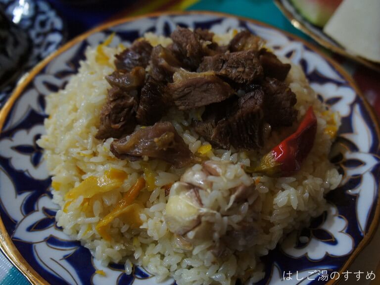 そしてウズベキスタンといえばコレ!「二郎系ごはん」で有名なプロフ。このプロフが、ウズベキスタンで食べた中で断トツのメチャ旨でした。はしっこに乗ってる柔らかく炊いたニンニクを混ぜて食べると「うわぁ」となるくらい美味しい。