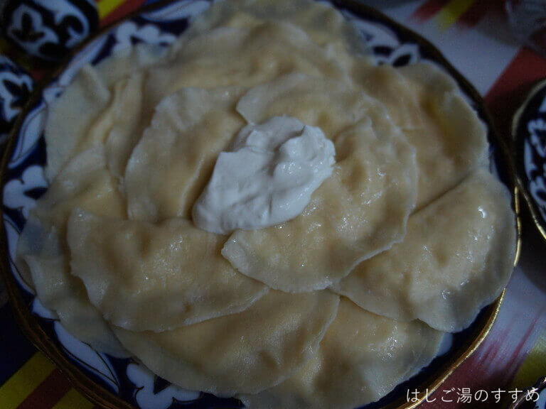 これは何だろー?中に卵みたいのが入った水餃子的なもので、上に乗ったサワークリームを付けて食べます。中央アジアやトルコのサワークリームって濃厚で爽やかで美味しいんですよ。