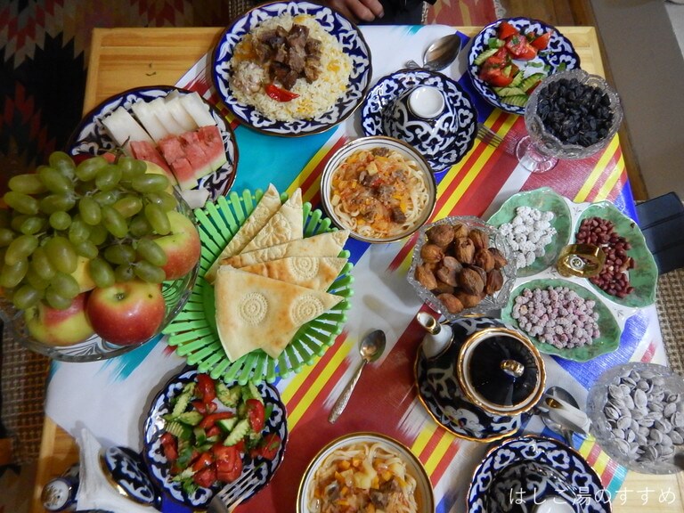 ホステルでは追加料金で夕食もお願いしました。街の食堂ではない家庭の奥さんが作るウズベキスタン料理に興味深々。