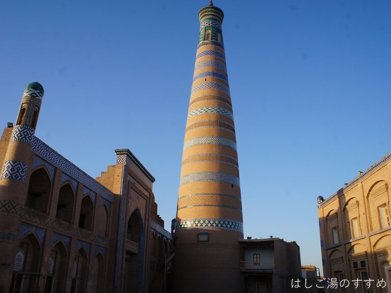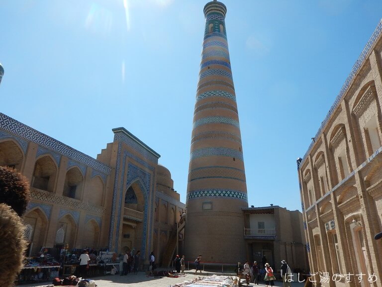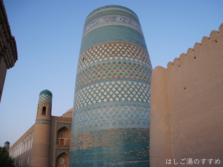 ヒヴァの中でよく目立つ大きなイスラーム・ホジャ・ミナレットです。ミナレットというのはアザーンを流す塔の事。アザーンとは何ぞ?と思った人は調べてみてください。
