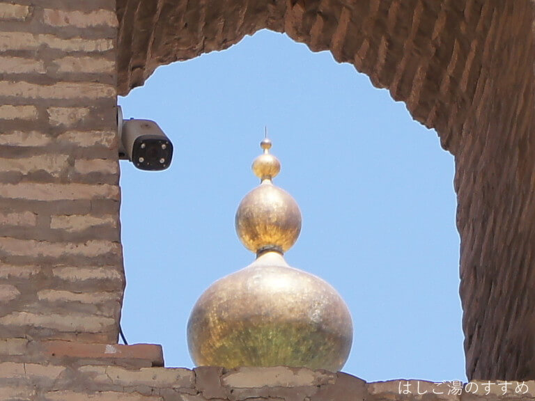 印象的なのは、門のうしろに見える青いドームの上に乗っかった、金色の瓢箪型の飾り。