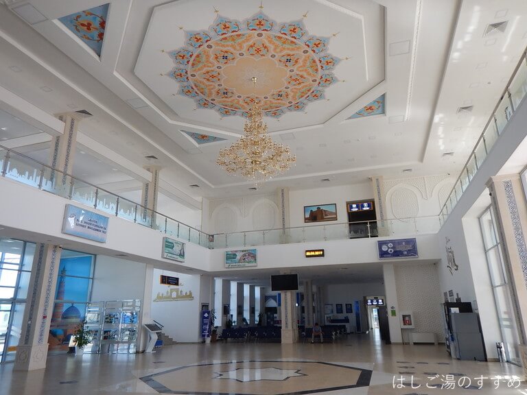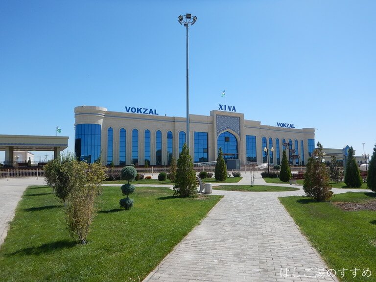 そして乗車当日。2019年8月時点でオープンしてまだ間もない、ピッカピカのヒヴァ駅です。