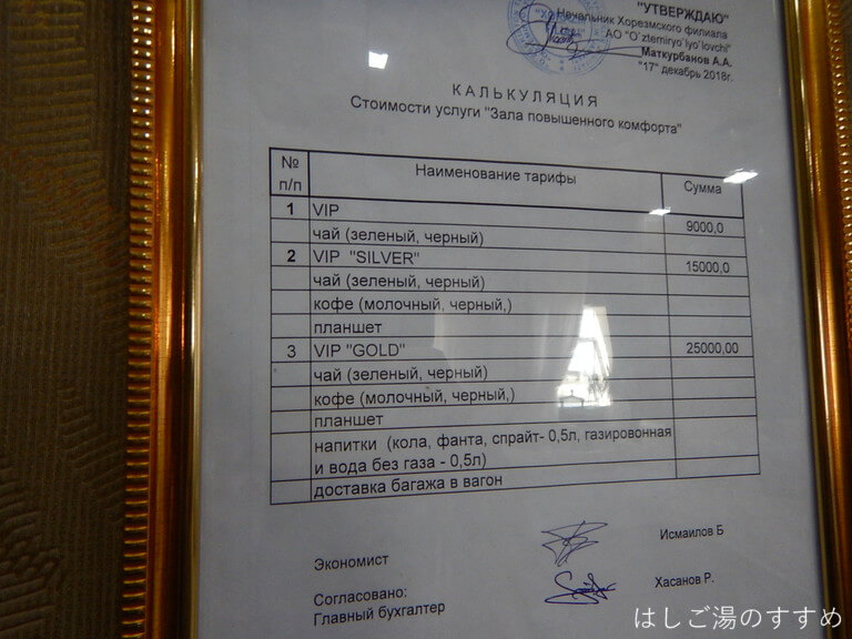 VIPルームの料金表です。値段の違いはオーダーできる飲み物でした。私達はコーヒーを注文できる「シルバー」にしました。