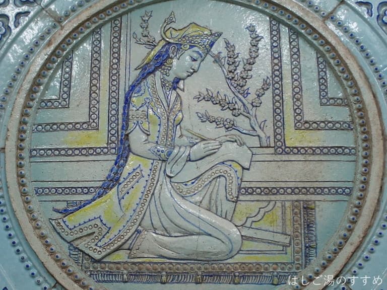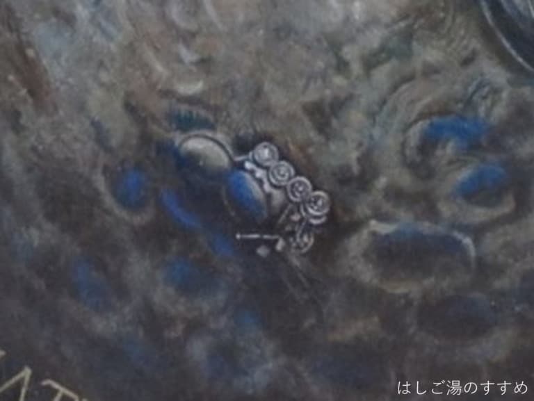 エレベーターで下っていると、どんどんモザイク画が迫って来てなかなかの迫力。しかもこのモザイク、よく見ると槐色や濃紺がさりげなくほどこされていて花びらがキラキラして見えるんですよ(画像はアレなんで現地で見てね)。