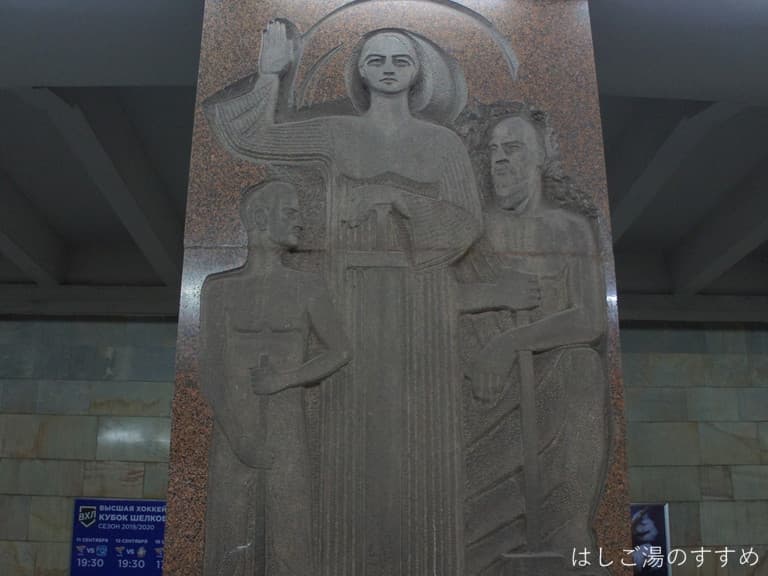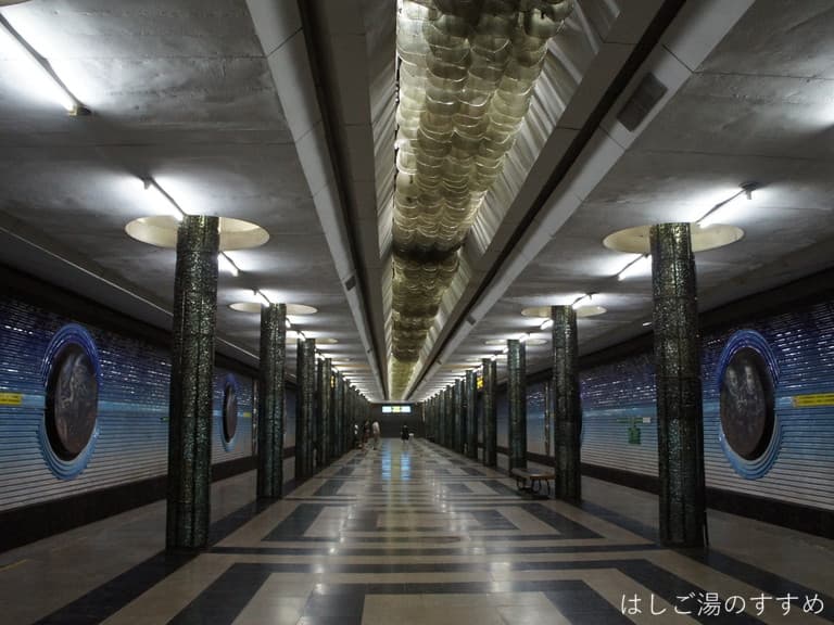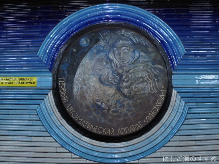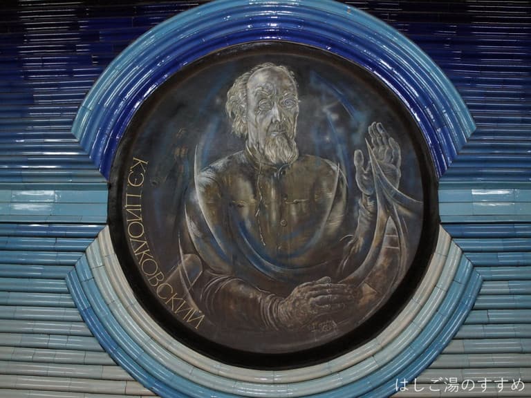 地下構内は夜空に瞬く星空をイメージしたのかキラッキラしてます。構内の壁には陶器製?のような素材の丸い枠の中に、旧ソ連以前からの宇宙開発に携わった人物などが描かれていました。