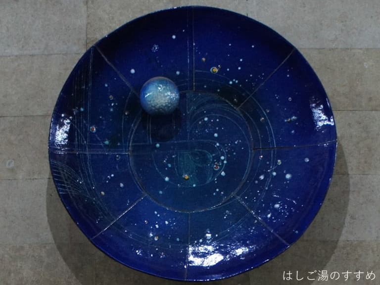 宇宙をイメージしたこのオブジェは陶磁器かな?ひとつだけ青い惑星が立体的に飛び出している。よーく見ると宇宙には軌道のように細い線がいくつも描かれてる。