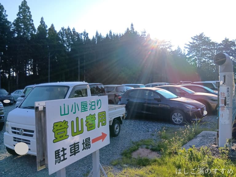 エスカルプラザの道路を挟んだ向かいにある、下が砂利の駐車場です。日帰り用と比べて駐車できる台数は少ないものの、土曜日朝6時の時点でまだ空きがチラホラ。