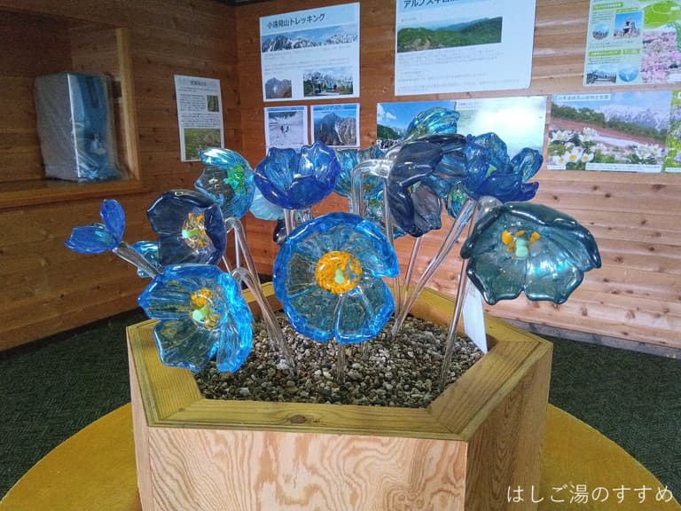 室内にガラス細工のヒマラヤの青いケシがあって、キレイでした。