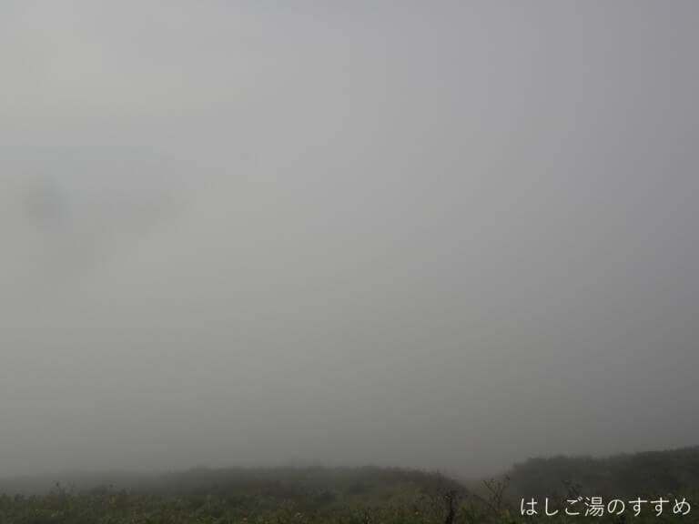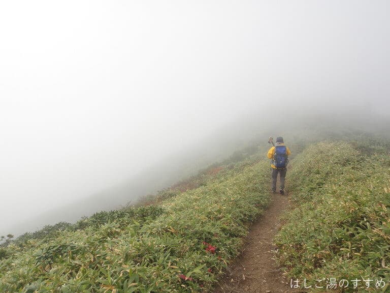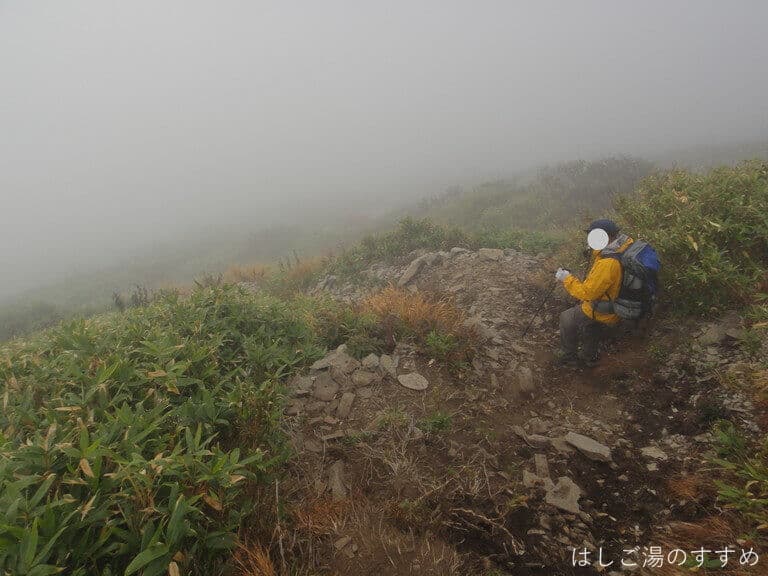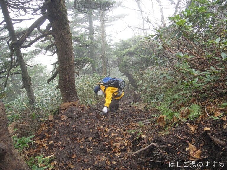この辺りからいよいよガスが深まり、木からの雫が雨のようにポタリポタリ・・。しまいには「これはもう、雨と言ってよし!」という位ザアアーッと降りだし雨具を着込みます。ちなみに、この時点での気温7.7℃。歩いているので全然寒くはないです。