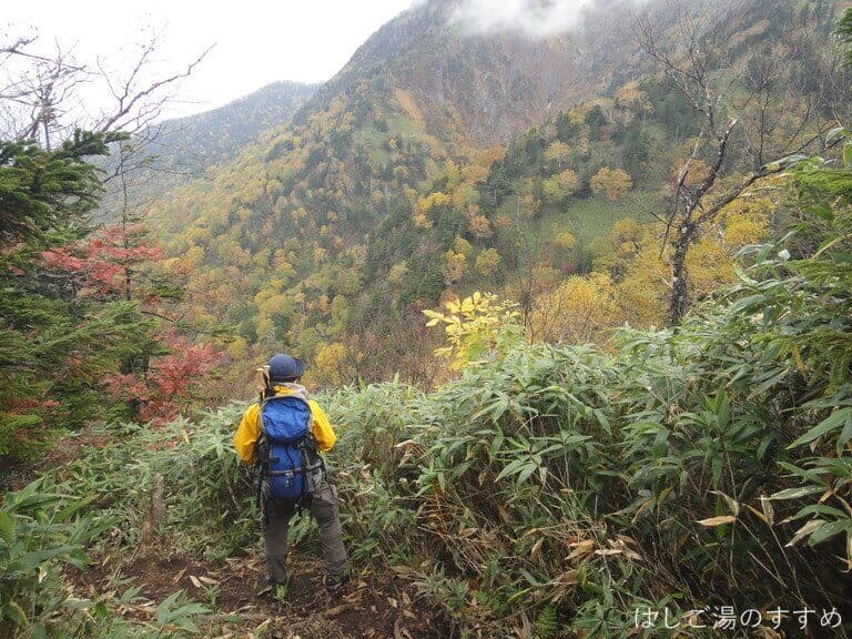 そして相変わらず真っ白な世界は続きます。本当なら遠くの山々も見渡せて、爽快な尾根歩きを楽しめたはず。せっかくの紅葉も、心なしかくすんでます。この先の剣ヶ峰分岐に至るまで、チョコマカとした上り下りの連続で地味に疲れた。