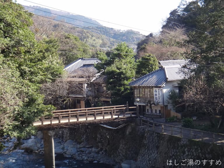 伊豆の中でもナゼか未湯だった湯ヶ野温泉に立ち寄りました。湯ヶ野温泉は河津川にそって数件のお宿と地元用共同浴場が点在する静かで小さな温泉地です。福田屋へは駐車場から小さな木造の橋を渡って徒歩で到着します。対岸から眺める古い木造建築の福田屋は大変風情があります。
