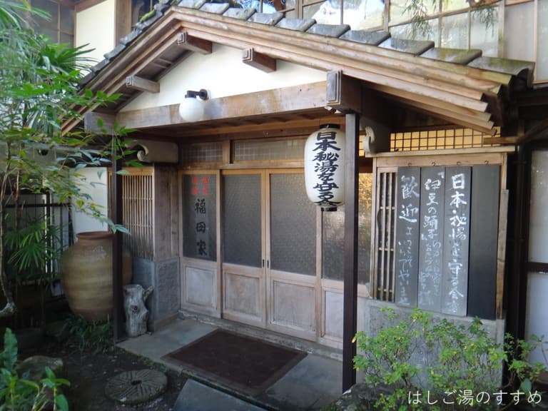 事前に電話して立ち寄りました。駐車場から徒歩2-3分ほどの橋を渡ったところに宿はありました。玄関前に着くと見慣れた提灯が目に入り、どうやら「日本秘湯を守る宿」会員宿のようです。電話連絡していたので立ち寄り受け付けはスムーズでした。