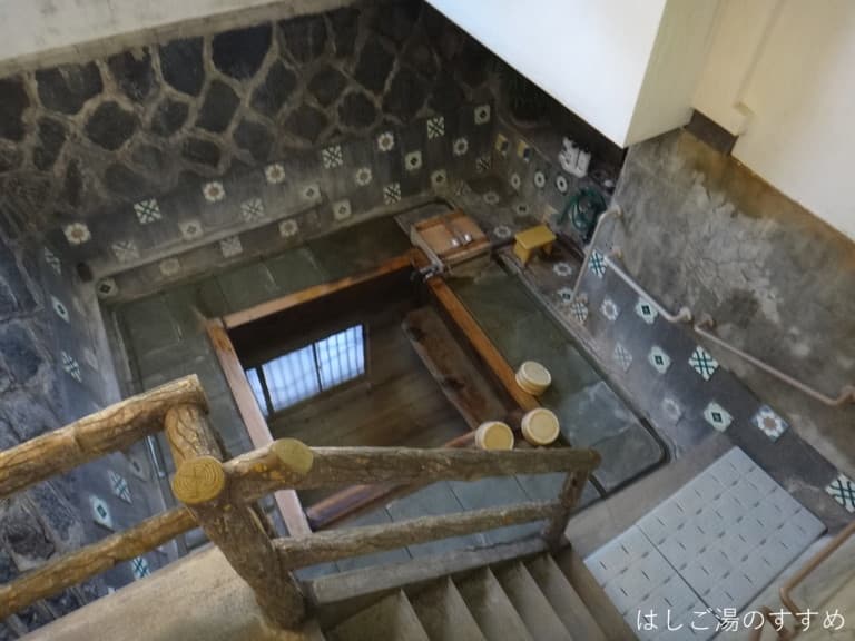 帳場近くの浴室入口を開けるとすぐに脱衣所があり、そこから階段を7-8段ほど下った所に正方形浴槽がありました。お宿隣に流れる川面とほぼ同じ場所にあり、昔からある浴室なんだと話すご主人。