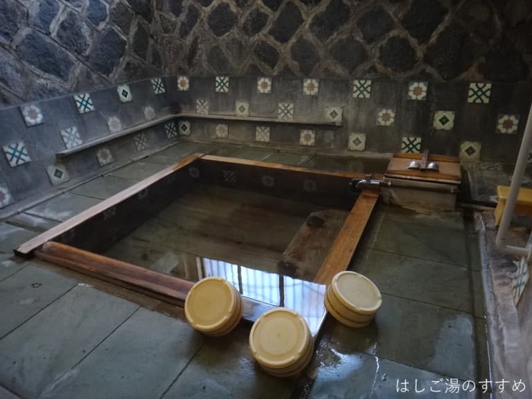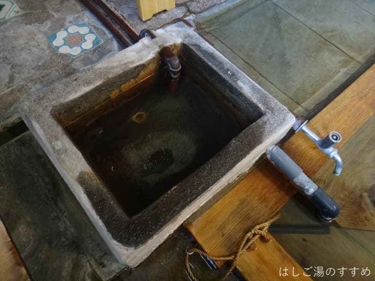 木造浴槽は3人サイズの小さめなもの。浴槽脇にある飲泉コップが置かれた貯湯枡から、ダイレクトに湯船へ源泉が注がれれている。温度は湯口で42.4℃、浴槽にて38.7℃とぬるめに調整されている。