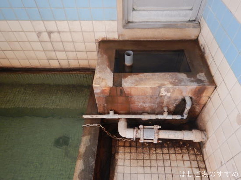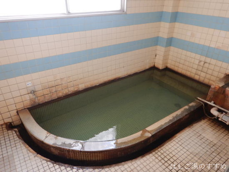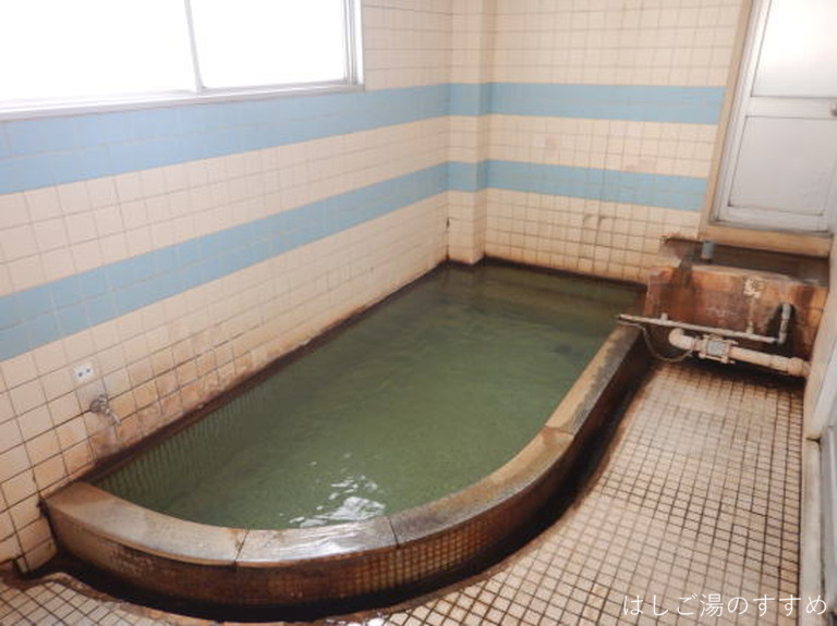 こぢんまりとした男女別浴室はシンプルな3人サイズタイル浴槽が一つあり、ほんのり黄色がかっても見える引っ掛かり感のある適温湯が、湯升を経て浴槽に流し込まれています。浴槽サイズにして投入量が多く入浴者が限られているので湯の状態は良好、地元の方のご厚意で良い湯に浸かることができ心から感謝です。