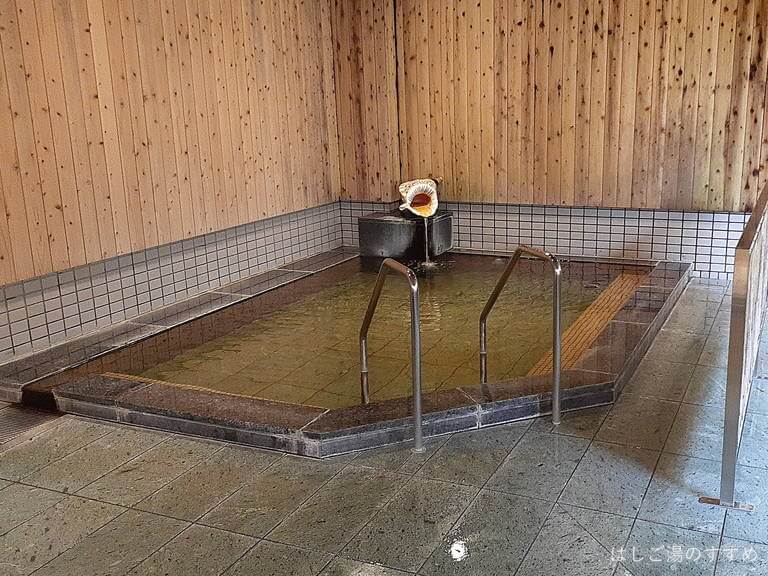 源泉は13.5℃と冷たくこれを加温して湯口から浴槽投入しているものと推測できます。浴槽湯からは感知できない湯口のみから独特の温泉臭がします。浴槽湯は無色透明、つるつるとした感じがあります。湯舟端の部分からはオーバーフローが確認できます。湯使いは半循環になるでしょう。源泉はメタけい酸の規定泉ですが、珍しい法螺貝の湯口は必見です。