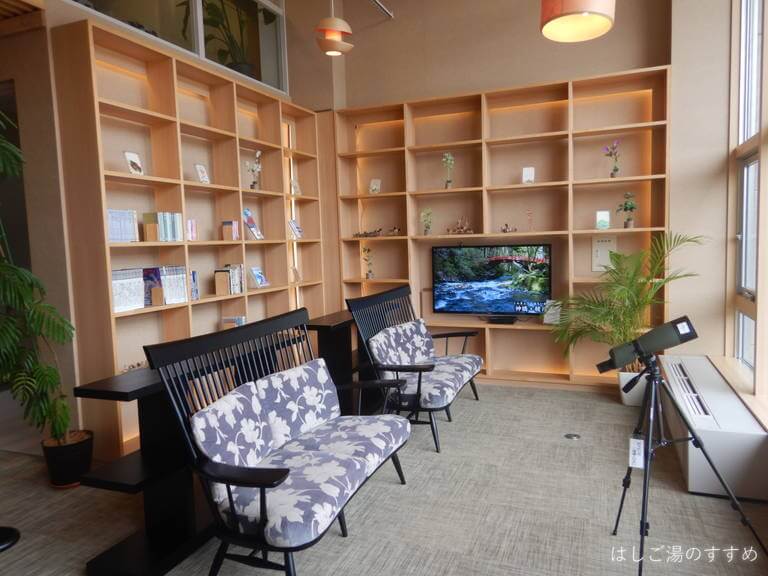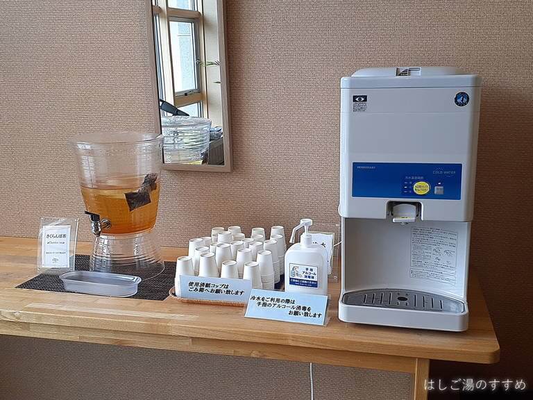 浴室の手前は待ち合わせに良さそうな雰囲気のいい休憩スペースになっていて、大きくとられた窓から周囲の森を眺めることができ、野鳥観察用の望遠鏡も置かれていました。訪問時には「さくらんぼ茶」という山形県らしい冷たいお茶も用意されていました。