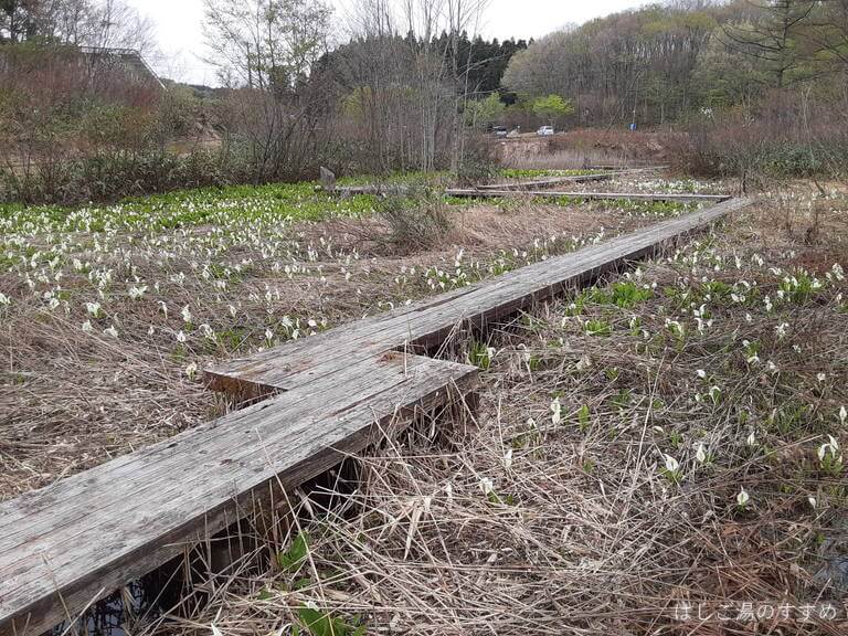 休暇村庄内羽黒駐車場のすぐ隣は「羽黒自然の小径」という遊歩道になっていて、静寂の池や木道の敷かれた遊歩道を散策することができました。2022年ゴールデンウィーク訪問時はたくさんの水芭蕉が咲いていました。羽黒自然の小径へは月山ビジターセンターの向かい辺りから入ることができました。