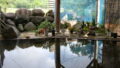 続く露天風呂は20人位はいけそうな池のような造りで、周囲の樹木や「男神山」を望む事ができます。こちらもまた鮮やかな湯の色で、木造管より「ぬるめ」の湯が打たせ湯のように投入、また、脱衣所寄りの浴槽内には熱湯が投入されています。内湯同様のギチギチ浴感に加え、(目視で泡は確認できなかったものの)まるで細かな泡付きでもあるようなスベッとした肌触りも感じます。芯からの温まり度も印象的。視覚的な印象が強いですが、お湯もなかなか気に入りました。