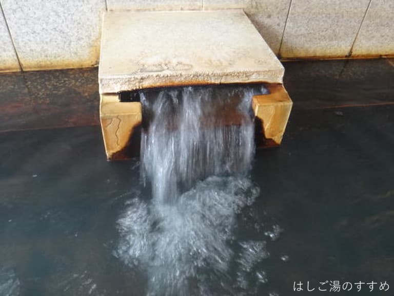 大浴室にはL字型の15人サイズ浴槽がひとつあり、やや熱めに加熱された無色透明湯が掛け流し利用されています。加熱ではあるものの豊富な溢れ出しがあり、二つある湯口付近では泡付も見られ、その効果で肌をさするとスベスベと気持ち良く、湯面からは金気土類臭がプンプン香り、満足度はかなり高い湯です。加水用を兼ねている非加熱源泉の投入蛇口が用意されているのも、温泉好きにはたまりません。シルバーウィーク初日にもかかわらずほぼ貸し切り状態だったのも嬉しい限りです。入れ違いで入って来た女性が「今日は空いているわね~、お休みだからかしら?」と仰っていたので、もしかすると平日の方が賑わうのかな?