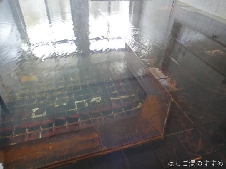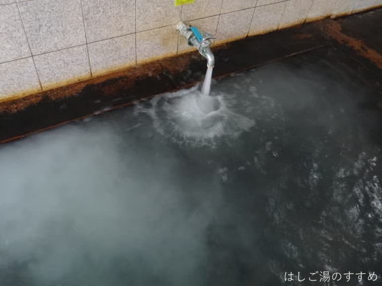 縦長のタイル長方形は大人8人ほどの広さだろうか。湯口は湯船壁側の中央部部にあり、60-70L/minの結構な投入量がある。湯船の洗い場側より見るも見事なオーバーフローが認められます。湯は薄らと濁り、金気土類臭味、弱く塩味でツルツルとした浴感あり。湯口近くには蛇口があって捻ると非加熱源泉がジャンジャンと出てきます。すぐさま浴槽表面付近が気泡で白っぽく見えます。湯使いは30℃そこそこの源泉を加温掛け流しといた具合です。鮮度も上々で以前以上に気に入りました。