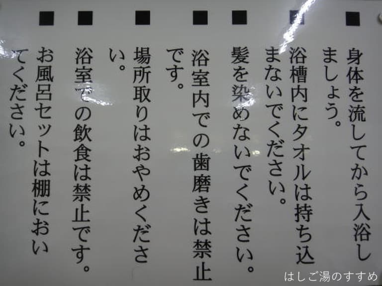 大浴場は大きい方と小さい方の2タイプあるが、日替わりによる男女交替制を採用している。当日の男湯は小さい浴槽だったが、自分はこちらの湯船はお初だったので良かった。浴室は若干熱気がこもっている環境なのはいただけない。他にお客さんが居なかったのでガラス窓全開で換気しながらの湯浴みとなった。