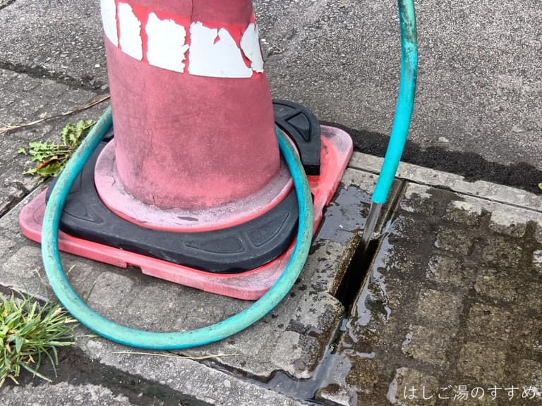 ▼玄関前で源泉が垂れ流しになっていました(飲用にしない条件で持ち帰りOKとのこと)