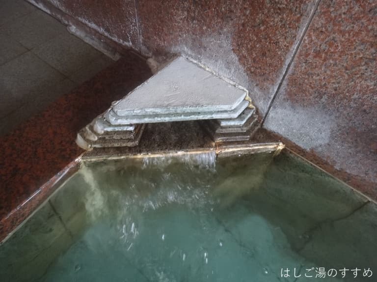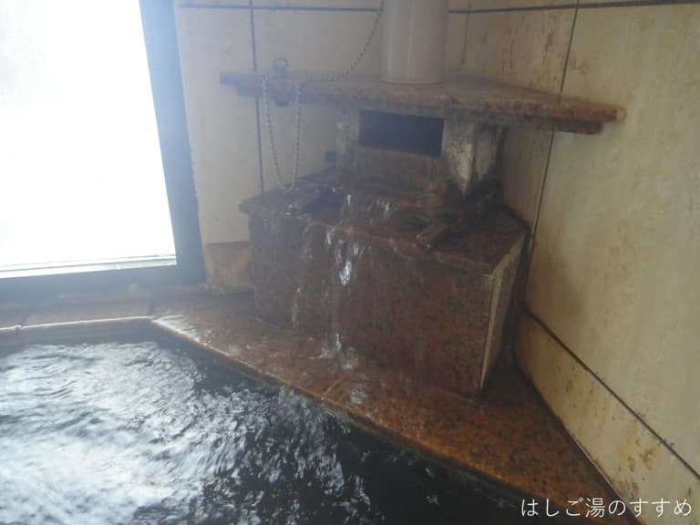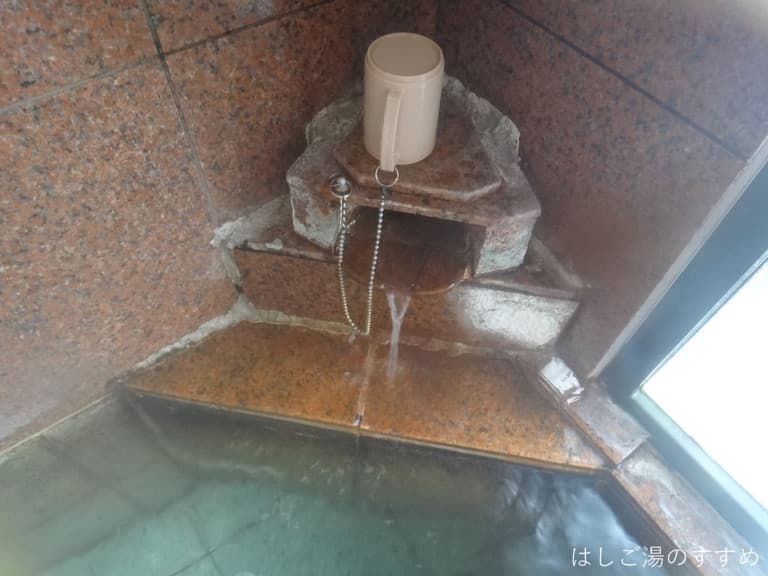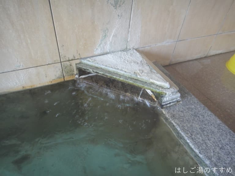 浴室は男女別に内湯+露天風呂がありましたが、露天風呂は時間外で湯が張られていませんでした。女性浴室には7~8人サイズの四角い浴槽がひとつあり、無色透明の適温湯が半循環利用されていました。湯口は二つあり、コップが置かれた湯口では薬っぽいようなカルシウムを思わせる風味のある湯が、適温になったり、やや熱くなったりと温度を変化させながら注がれています。この湯口から注がれるぶん程の溢れ出しが常時あり、おそらくはココが源泉の投入口かと思われます。もうひとつの湯口は常に一定の適温湯が注がれ、おそらくはコチラは循環湯かな?浴槽温度はストレス無く浸かれる適温で、優しさを感じる霊泉寺の湯でした。