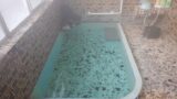 露天風呂は屋根掛けされた3人サイズのタイル浴槽です。そこへ木樋を通じ加温した源泉を湯船へと注いでいました。無色透明、弱温泉臭ありで加温掛け流しです。