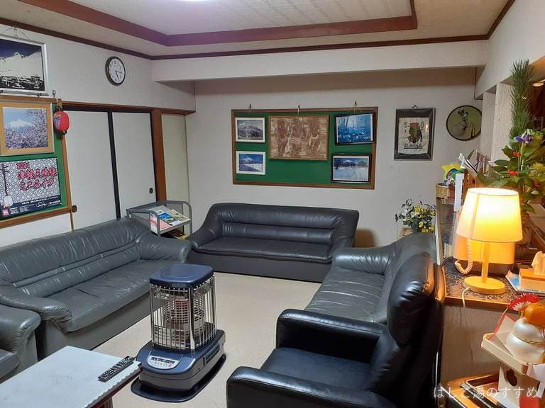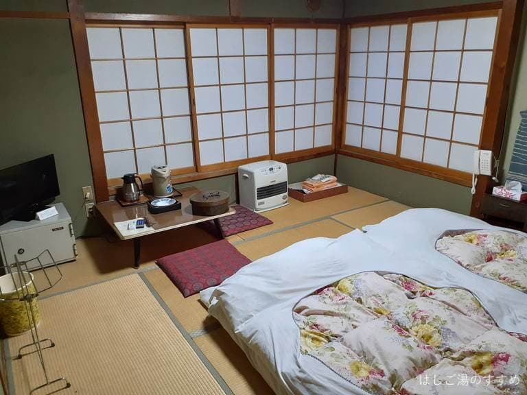 案内された部屋は玄関側の上に位置する8畳和室です。到着すると既に布団が敷かれていました。年季は入っているものの清掃はきっちり行われていて、設備・備品はテレビ、セーフティボックス、換気の必要な石油ヒーター、お茶セット、タオル浴衣、冷水がありました。トイレは共同となります。