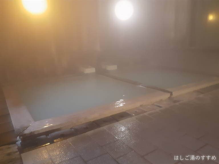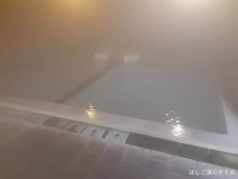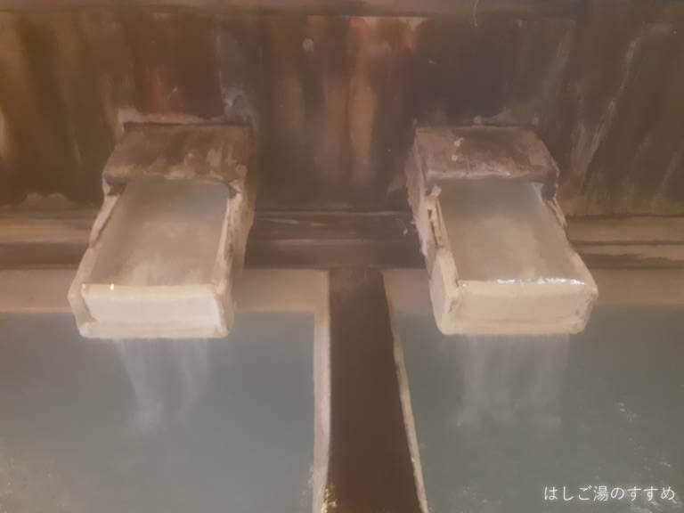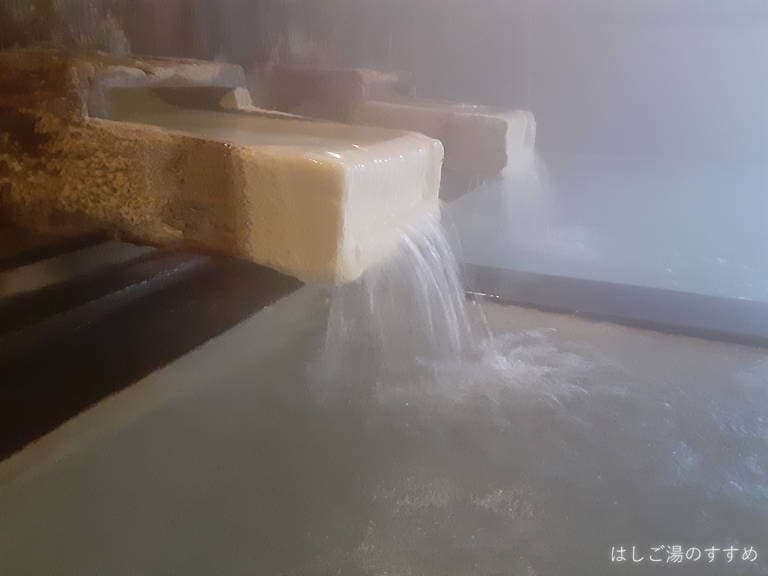 黄白い湯花がこってりと付着した湯口から掛け流される湯はスルッとした肌触りがあり、湯面から硫化水素臭と甘ったる明礬臭がムンムン、一口含むと明瞭な酸味を感じます。湯の中には細かな白湯花が舞い白濁を帯びて見え、温泉マニアでない人も「温泉に来た」という旅情が強く感じられる湯と思いました。また、いつ入っても満足度の高い湯ですが、特に宿泊した翌朝のまだ誰も入っていないと思われる早い時間の鮮度湯は最高でした。