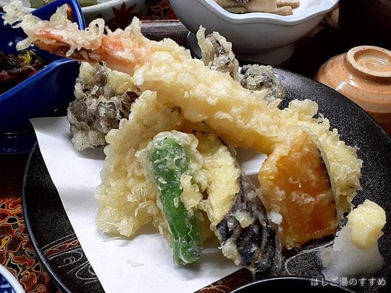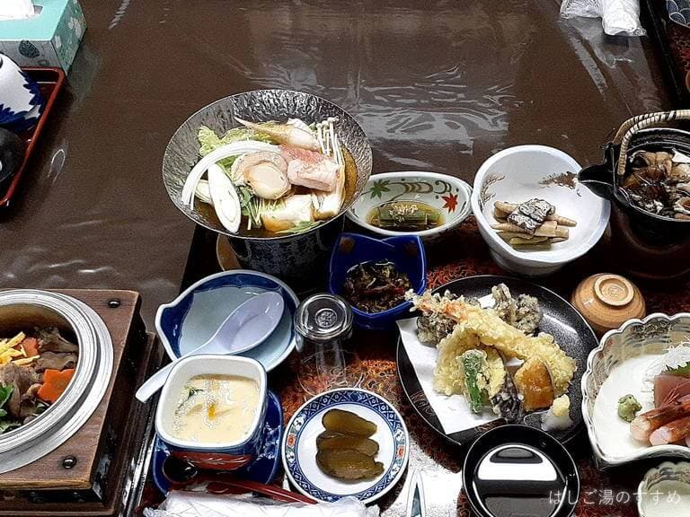 食事は夕食6時半、朝食は7時半にお願いしました。夕飯時にはお宿の方が呼びに来てくれました。食事は二階の大広間でいただきます。ほとんどの品は配膳してありましたが天ぷらは熱々で美味しかったです。ビールにじょっぱりの冷酒をいただいて満足のひとときでした。