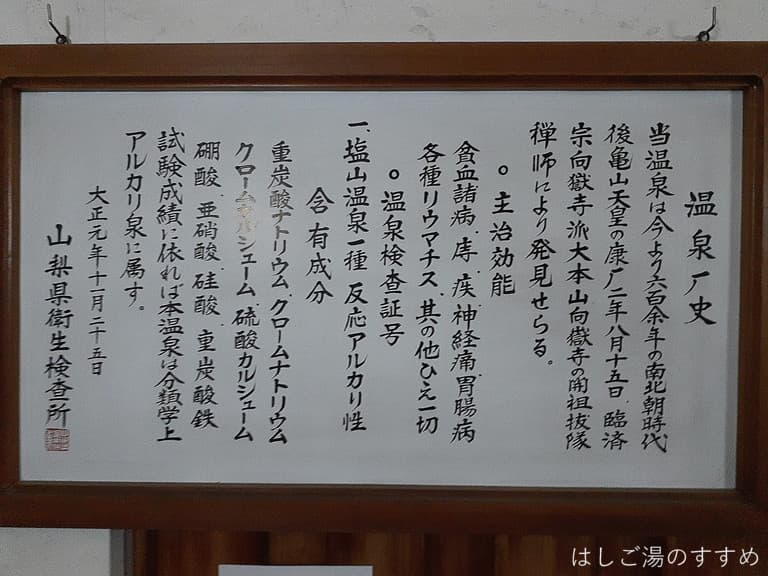 塩山温泉 第2井 単純硫黄冷鉱泉 23..8℃(掘削動力)pH=10.1 溶存物質計=169.4mg Na=45.9mg(96.38mv%) K=0.3 Ca=1.1 F=1.8 Cl=11.6 OH=2.1 HS=2.4 SO4=4.1 HCO3=36.0(22.00) CO3=27.0 HSiO3=35.8 BO2=1.1 (H19.2.2) ※温泉利用状況=加温あり・循環ろ過あり