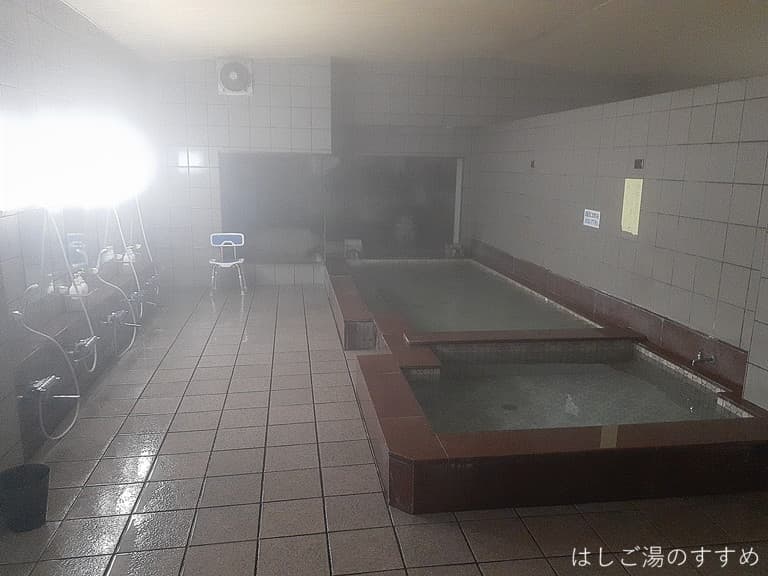 女性浴室は、大小二つに仕切られた内湯浴槽がありました。まずは大浴槽ですが、7~8人サイズの長方形で、加温循環湯が使用されていました。適温調整された湯はほぼ溜め湯状態で、劣化による弱い白濁が生じ塩素臭もプンプンで、こちらは早々に撤収。