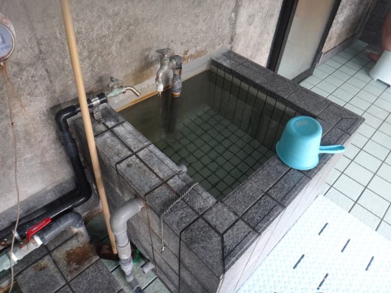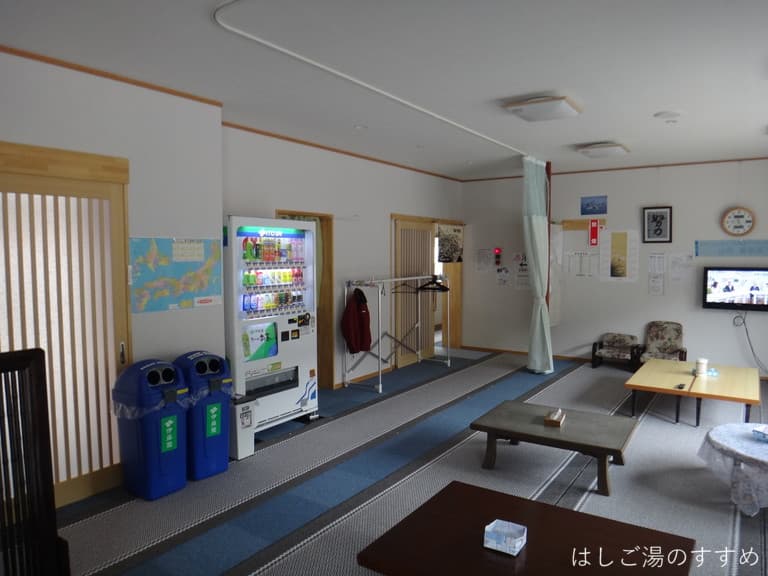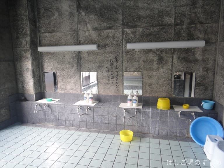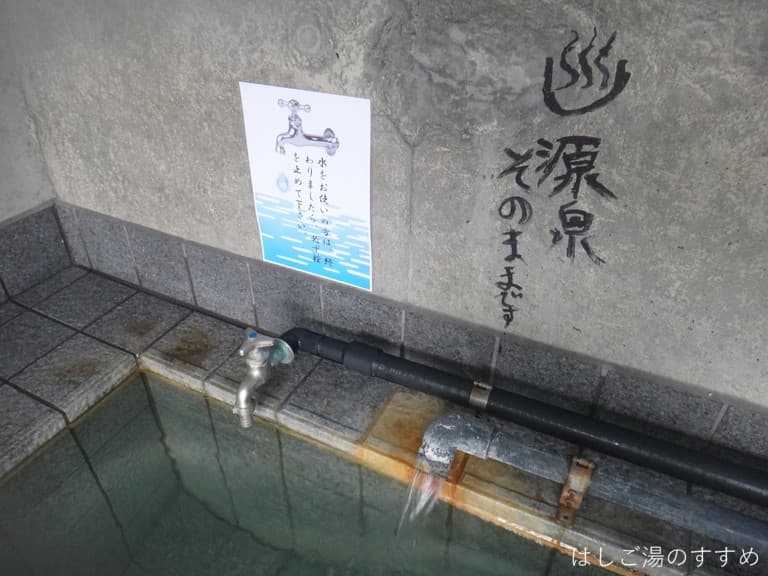 洗い場はシャワー無しのカラン4台ほどで「シャワーがつけられないのでお湯を沢山出してお使いください」の案内があるのは、おそらく湯量は豊富なのでしょう。浴後はポカポカ感が持続し、ちょっとした休憩所があるので水分補給がてら一休みしてから施設を後にした。