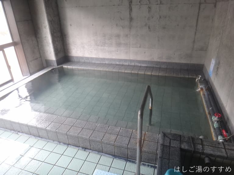 浴室もコンクリ打ち放しの空間。浴槽は5-6人サイズの長方形タイル風呂。湯は熱めで掛け湯で慣らしてからでないとすんなり浸かれずでした。体感で44℃弱はあったかと思われます。無色透明、弱とろみ感、口に含むと成分の雑味が残る感じもします。湯口は何の飾りもないシンプルな塩ビ管、入浴客が多いと鮮度面でちょっと心配な感じの投入量です。