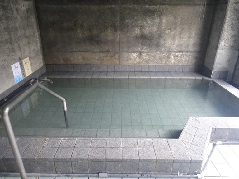 浴室はコンクリ打ちっぱなしのような壁と、タイルの浴槽そして洗い場といった造りで、全体的にシックなグレーの印象が強く、人によっては洒落ても見えるし、簡素にも見えるし・・といったとこでしょーか。肝心の湯は熱めの無色透明湯が掛け流し。口に含むと重曹の甘味とカルシウム的な雑味が口に残り、カルシウム感のあるベタベタとした肌触りがします。近隣の旅館のようなタマゴ臭はしません。浴後の温まりが強く、いつまでもホカホカしています。