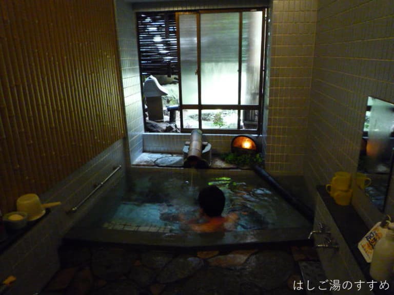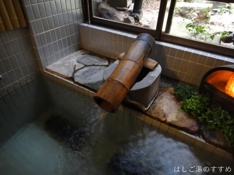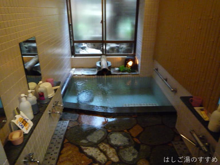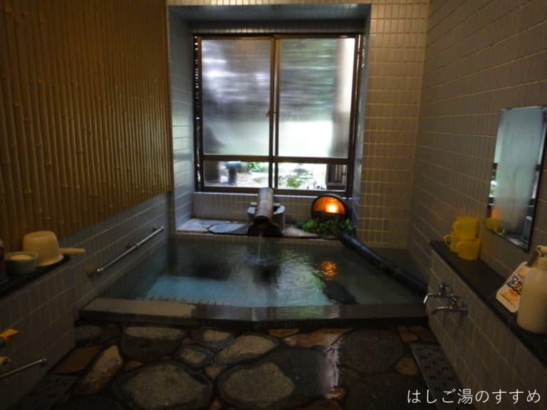女性浴室はとてもこぢんまりとした造りで、2人サイズのタイル浴槽がひとつ。浴槽縁には仄かな灯りの照明が置かれ、どこか温もりある雰囲気を醸し出しています。竹筒湯口より流し込まれる無色透明の源泉は、ジャンジャン溢れ出しタイプではないものの、浴槽サイズに見合った投入量があり「ぬるくなく熱くなく」の程よい適温となっています。湯面からは心地よい温泉臭が香り、しばらく入る人がいなかったのか鮮度良好の掛け流し。唯一の難点は、季節柄か浴室内の湿度ごもりが強く、ちょっとしたサウナ状態だった事。良い湯に後ろ髪ひかれつつ、夏場の湿度に負けての撤収となりました。