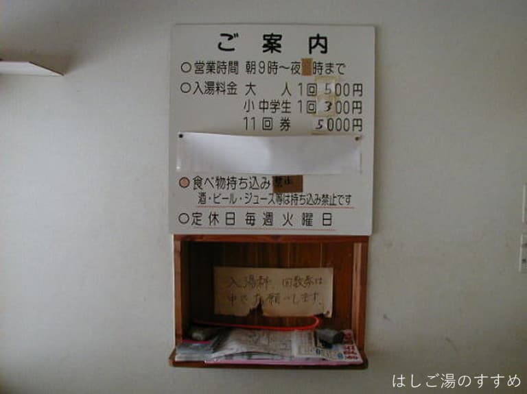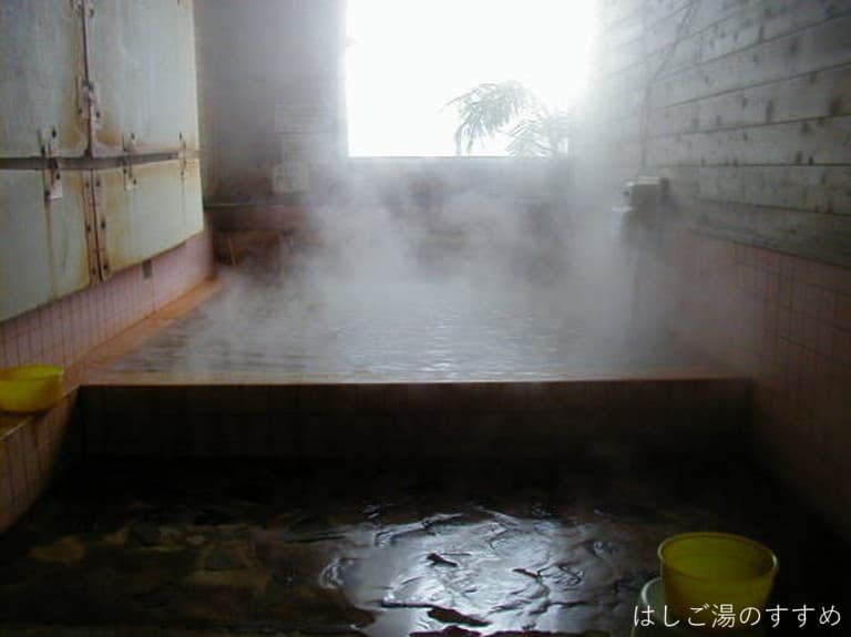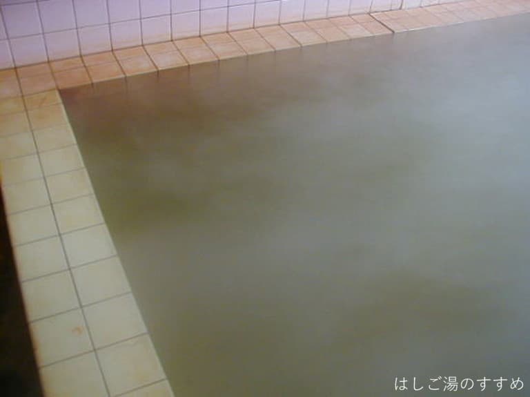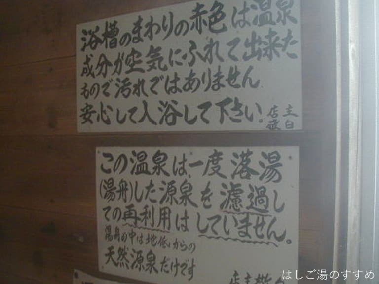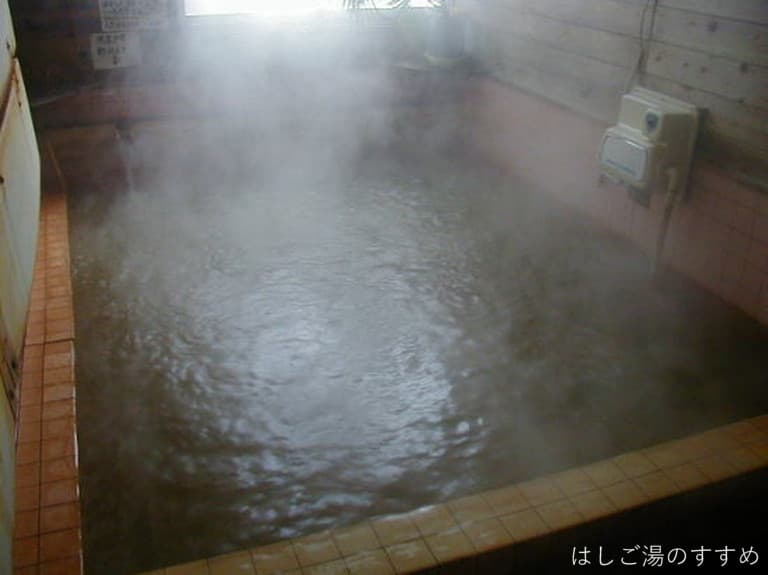 浴室は男女別の内湯。浴室に入った途端、なんともいえぬ妙な臭いがします。これは多分お湯の臭いではなく、壁にかけられているお風呂の蓋から発せられるものだと思います。お湯自体は柔らかな優しい臭いがします。薄黄土色で表面には謎の油粒も少量プカプカ。一口含むと極薄甘塩鉄味。一部がブクブクとなっている浴槽でした。玄関には分析表を印刷した紙が置かれ、お客さんが持って帰られるようになっています。