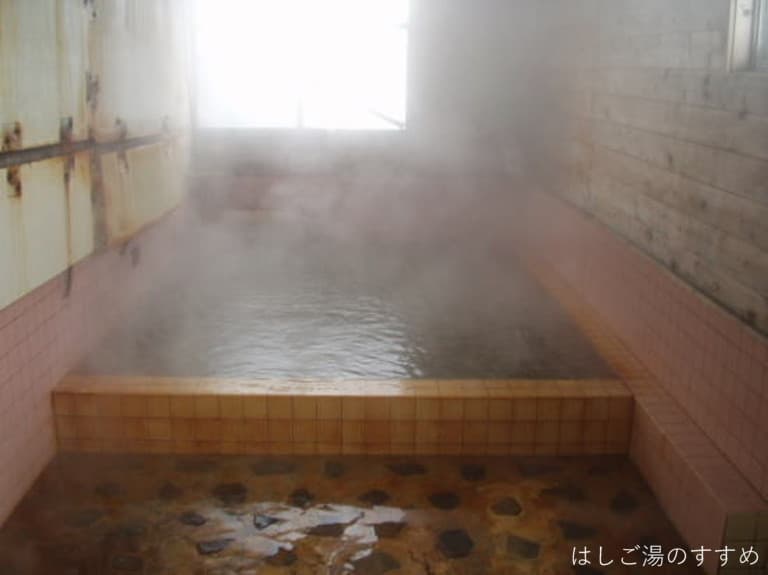 男女別浴室にはタイル張りの正方形浴槽が一つあるのみ。湯は薄茶色で濁り、湯口で金気臭、硫黄臭。すべすべ感とちょいきしむ感じがあります。20L/min程度の源泉投入、飲泉可能です。ここの浴槽になんと昔なつかしの、ジェットバスの原点とでもいうべき「バブルスター」があるではないですか。未だに使用しているなんて、、、。負けました。とにかくここは結構な良い湯なのでした。