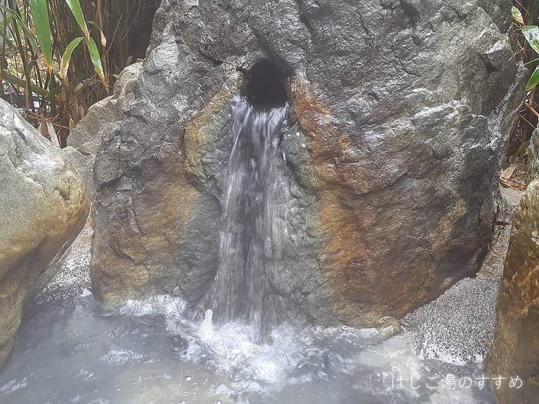 お次は露天風呂へ向かいます。露天風呂は屋根掛けされた東屋風で塀の向こうにガスで煙る山々が見えました。露天風呂には5~6人サイズの長方形浴槽がひとつあり、木をくりぬいたような湯口より「ブホッブホッ」と音を立てながら適温湯湯が吐き出されています。浴槽サイズにして鮮度良好たっぷりな掛け流し。灰白濁りの湯は気持ちいいくらいの強ヌルヌルスベスベで、内湯と同じく露天風呂もローションのような肌触りです。