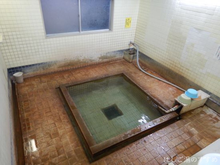浴室の中央部分に四角形タイル浴槽が配置されています。浴室床は長年にわたり温泉が流れたせいか茶系に変色しているのと析出物の付着があります。塩ビ湯口からは透明なお湯が約7-8L/minほど浴槽へ注がれていました。湯温は約42.5℃の適温、お湯は無色でこなれ感があり浸かりやすいです。ただ、湯口の湯を口に含みましたが酸性泉というには酸味を感じることができませんでした。温泉利用状況で加水あり、ということですので加水により薄くなってしまったのかもしれません。源泉そのものを観察してみたいですが今となっては残念です。