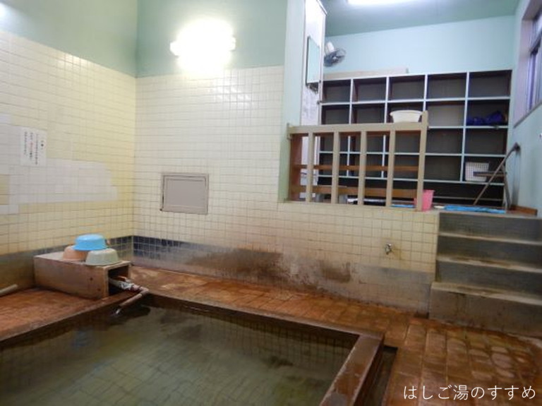 脱衣スペースから数段の階段を下った浴室には2~3人サイズ浴槽がひとつあります。女湯の浴槽はちょっと変わった台形のような形をしていて、訪問時は浴室の析出物の色からか薄黄土濁りがかっても見えるほぼ無色透明、弱いキシキシ感のある熱めの湯が満たされていました。浴後に知ったんですが、男湯は普通の四角形浴槽なんですね。