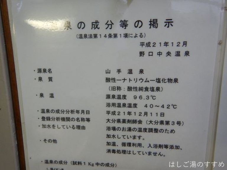 山手温泉 酸性-ナトリウム-塩化物泉 96.3℃ pH=? 溶存物質計=2.656g H=1.6mg Li=4.6 Na=581 K=143 NH4=2.6 Mg=3.8 Ca=35.3 Sr=0.2 Mn=1.1 Fe2=2.3 Zn=0.3 F=1.4 Cl=925 Br=2.6 I=0.2 HSO4=16.6 SO4=311 NO3=0.4 HPO4=0.4 H2SiO3=593 HBO2=29.1 HAsO2=1.1 CO2=22.4 As=0.7 (H21.12.11) ※温泉利用状況=加水あり