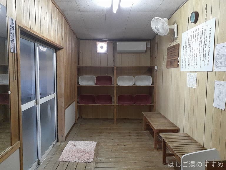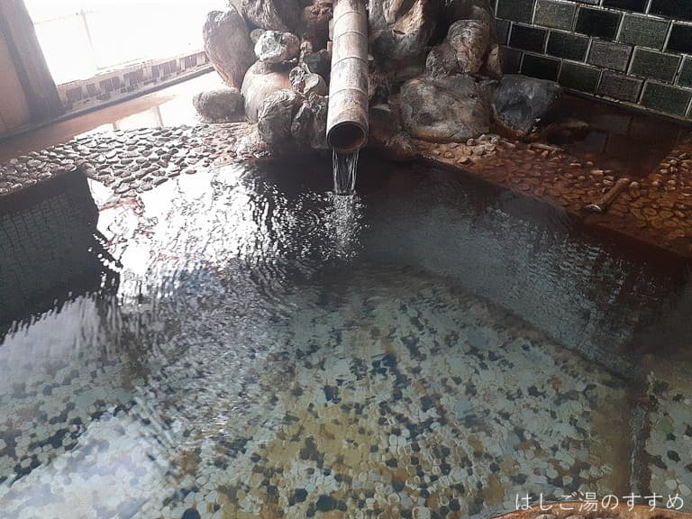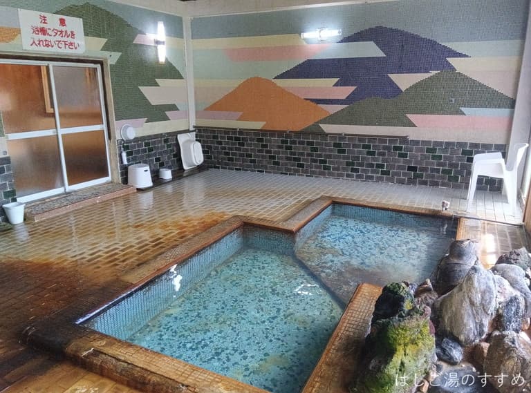 浴槽内は少し深さに違いを付けていて、普通の深さとちょい深めの湯舟2つといった感覚かな?お湯は体感で約41℃位、無色やや微濁り、弱ツルツル感あり。排湯されるオーバーフロー道は析出物により茶系色に染まっていました。掲示の利用状況を見ると循環ろ過あり、との事ですが実際に確認できずでした。